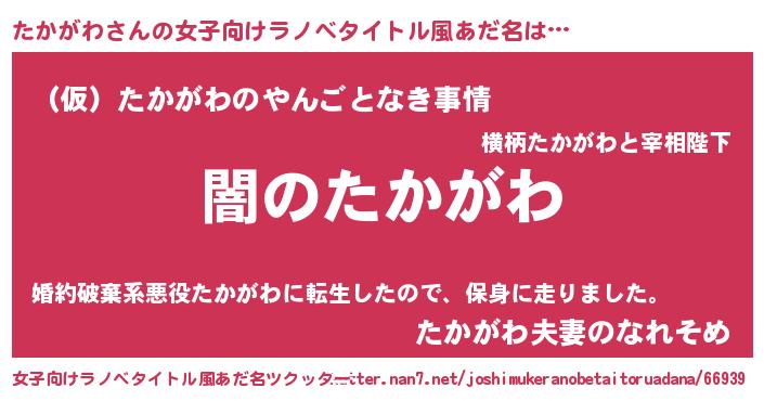 | 男性向けラノベタイトル風あだ名 | 『Re:たかがわから始める異世界生活』 |