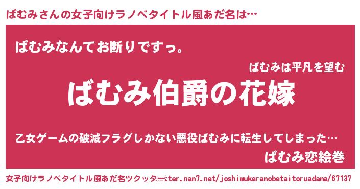 | 男性向けラノベタイトル風あだ名 | 『うちの娘の為ならば、俺はもしかしたらばむみも倒せるかもしれない。』 |