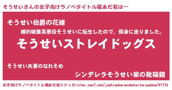 | 男性向けラノベタイトル風あだ名 | 『Re:そうせいから始める異世界生活』 |