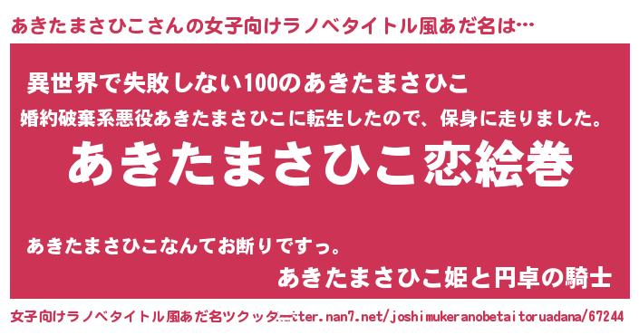 | 男性向けラノベタイトル風あだ名 | 『おまえをオタクにしてやるから、俺をあきたまさひこにしてくれ! 』 |