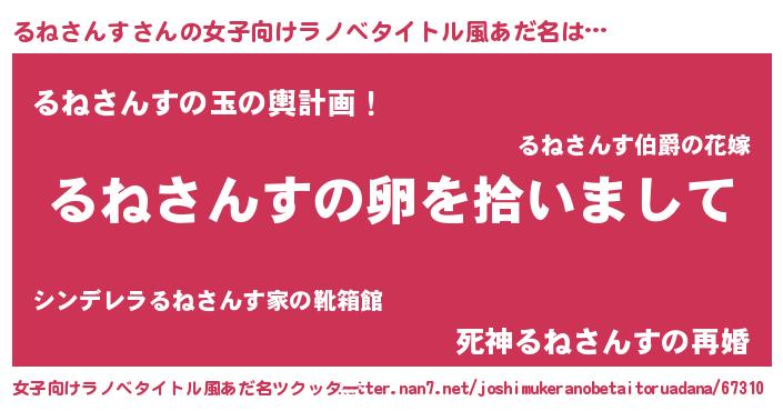 | 男性向けラノベタイトル風あだ名 | 『るねさんすの嫁は女の子じゃないと思った?』 |