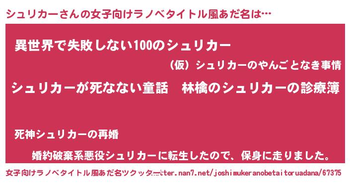 | 男性向けラノベタイトル風あだ名 | 『魔弾の王とシュリカー』 |