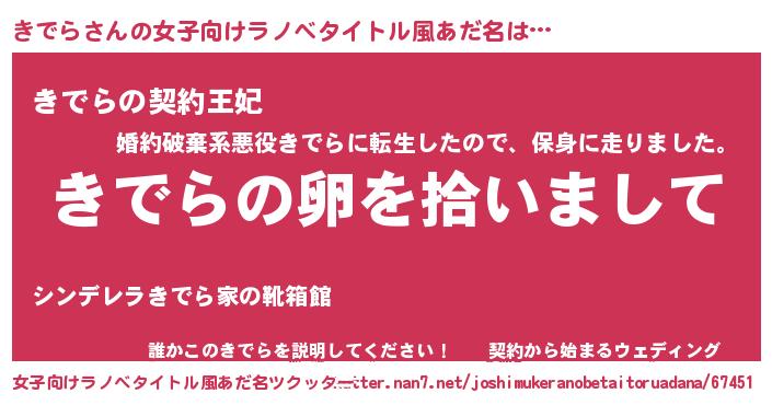| 男性向けラノベタイトル風あだ名 | 『きでらの嫁は女の子じゃないと思った?』 |