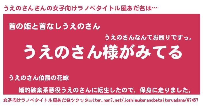 | 男性向けラノベタイトル風あだ名 | 『うえのさんの嫁は女の子じゃないと思った?』 |