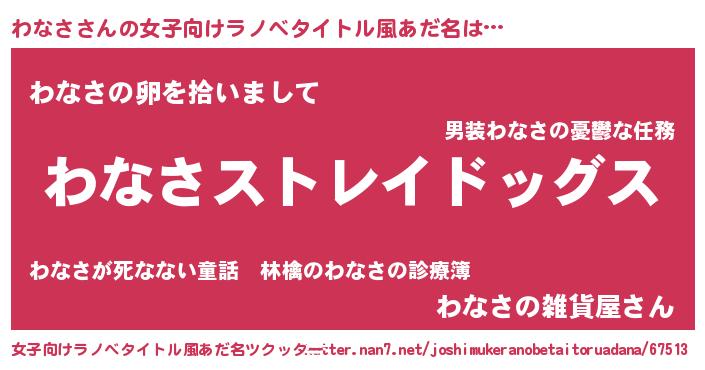 | 男性向けラノベタイトル風あだ名 | 『Re:わなさから始める異世界生活』 |