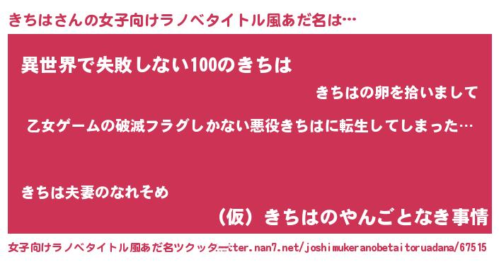 | 男性向けラノベタイトル風あだ名 | 『魔弾の王ときちは』『きちはの憂鬱』 |