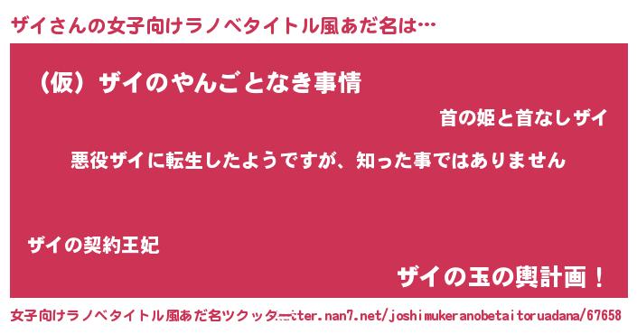 | 男性向けラノベタイトル風あだ名 | 『この素晴らしい世界にザイを!』 |