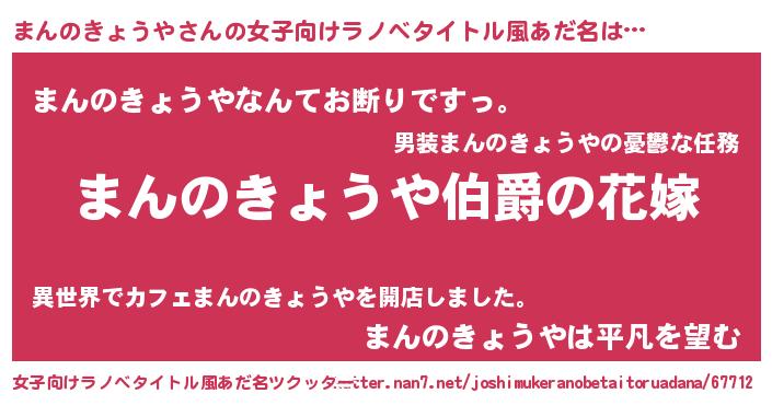 | 男性向けラノベタイトル風あだ名 | 『うちの娘の為ならば、俺はもしかしたらまんのきょうやも倒せるかもしれない。』 |