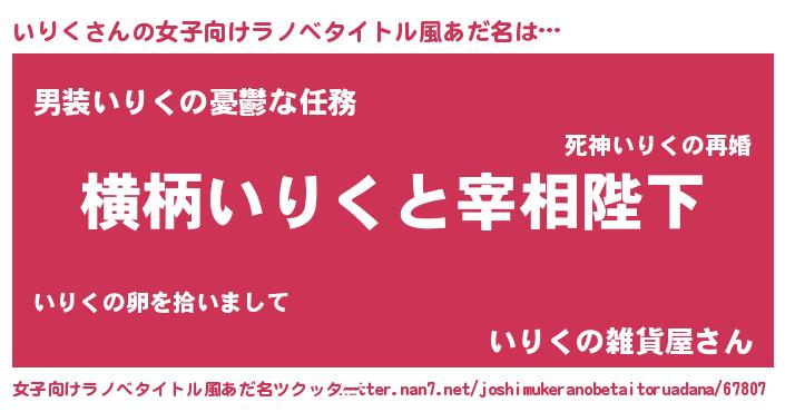 いりくさんの女子向けラノベタイトル風あだ名は… 『横柄いりくと宰相陛下』『男装いりくの憂鬱な任務』『いりくの雑貨屋さん』 ツクッター #女子向けラノベタイトル風あだ名ツクッター http://tkutter.nan7.net/joshimukeranobetaitoruadana/67807/