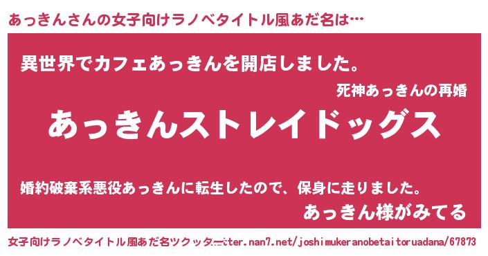| 男性向けラノベタイトル風あだ名 | 『Re:あっきんから始める異世界生活』 |