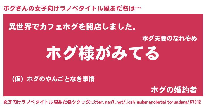 | 男性向けラノベタイトル風あだ名 | 『ホグの嫁は女の子じゃないと思った?』 |