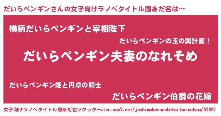 | 男性向けラノベタイトル風あだ名 | 『おまえをオタクにしてやるから、俺をだいらペンギンにしてくれ! 』 |