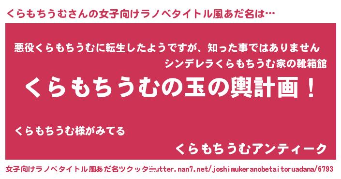 | 男性向けラノベタイトル風あだ名 | 『くらもちうむ~年齢イコール彼女いない歴の魔法使い~』 |