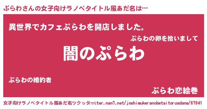 | 男性向けラノベタイトル風あだ名 | 『Re:ぷらわから始める異世界生活』 |