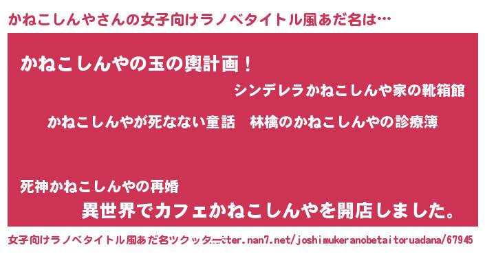 | 男性向けラノベタイトル風あだ名 | 『魔弾の王とかねこしんや』 |