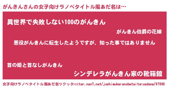 | 男性向けラノベタイトル風あだ名 | 『この素晴らしい世界にがんきんを!』 |