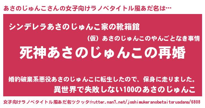男性向けラノベタイトル風あだ名 | 『ノーゲーム・ノーアサノジュンコ』 |