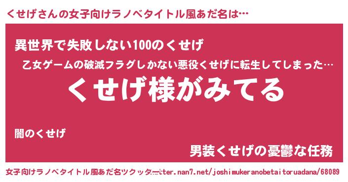 | 男性向けラノベタイトル風あだ名 | 『くせげの嫁は女の子じゃないと思った?』 |