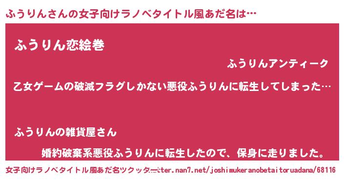 | 男性向けラノベタイトル風あだ名 | 『魔弾の王とふうりん』 |