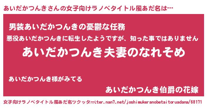 | 男性向けラノベタイトル風あだ名 | 『おまえをオタクにしてやるから、俺をあいだかつんきにしてくれ! 』 |