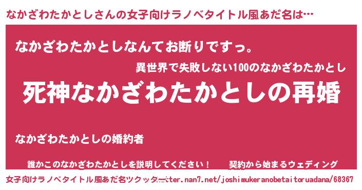 なかざわたかとしさんの女子向けラノベタイトル風あだ名は… 『死神なかざわたかとしの再婚』『なかざわたかとしなんてお断りですっ。』『誰かこのなかざわたかとしを説明してください! ~契約から始まるウェディング~』 ツクッター #女子向けラノベタイトル風あだ名ツクッター http://tkutter.nan7.net/joshimukeranobetaitoruadana/68367/