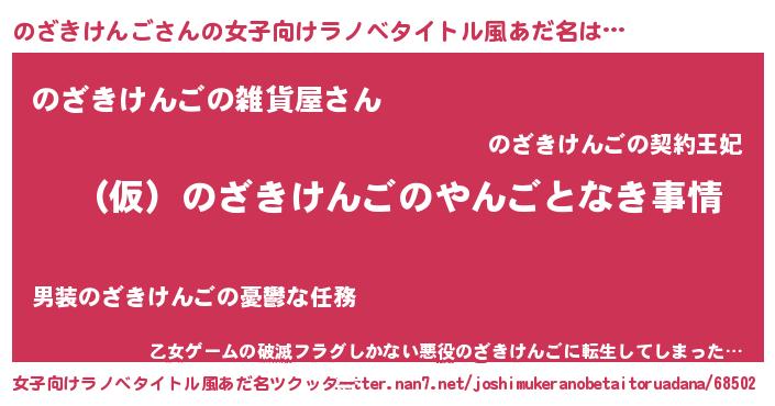 | 男性向けラノベタイトル風あだ名 | 『のざきけんごの憂鬱』 |