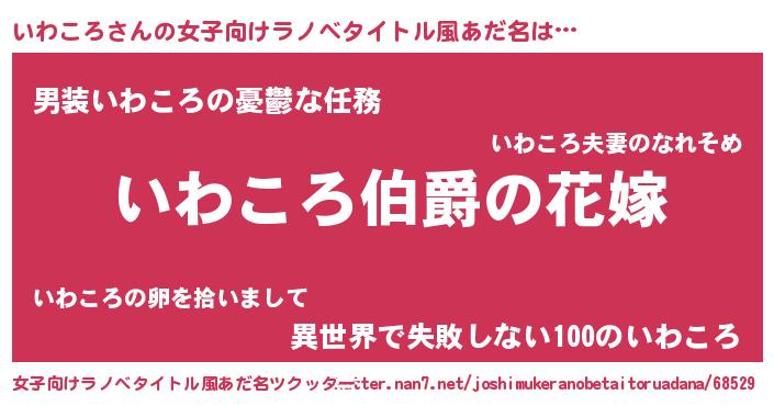 いわころさんの女子向けラノベタイトル風あだ名は… 『いわころ伯爵の花嫁』『男装いわころの憂鬱な任務』『異世界で失敗しない100のいわころ』 ツクッター #女子向けラノベタイトル風あだ名ツクッター http://tkutter.nan7.net/joshimukeranobetaitoruadana/68529/