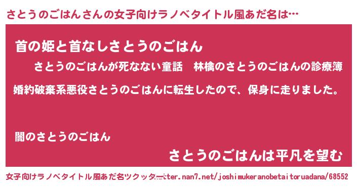 | 男性向けラノベタイトル風あだ名 | 『サトウノゴハンスレイヤー』 |