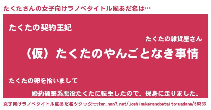 | 男性向けラノベタイトル風あだ名 | 『たくたの憂鬱』『タクタスレイヤー』 |