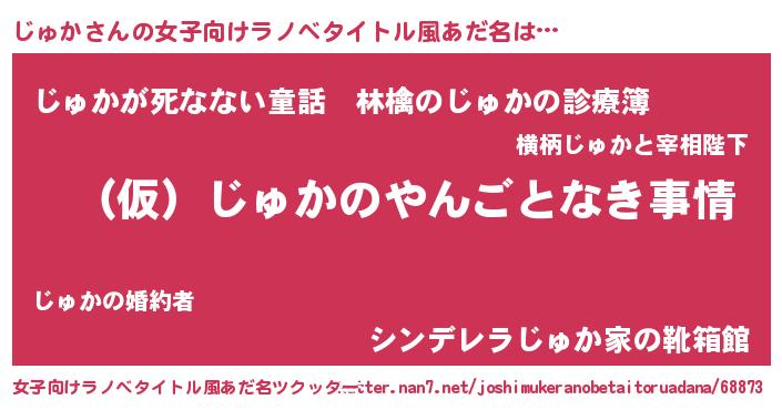 | 男性向けラノベタイトル風あだ名 | 『じゅかの憂鬱』『魔弾の王とじゅか』 |