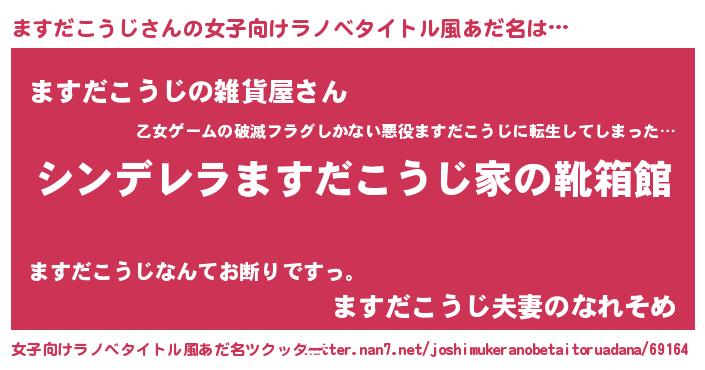 ますだこうじさんの女子向けラノベタイトル風あだ名は… 『シンデレラますだこうじ家の靴箱館』『ますだこうじの雑貨屋さん』『ますだこうじ夫妻のなれそめ』 ツクッター #女子向けラノベタイトル風あだ名ツクッター http://tkutter.nan7.net/joshimukeranobetaitoruadana/69164/