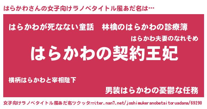 | 男性向けラノベタイトル風あだ名 | 『誰もが恐れるあのはらかわが、ぼくの専属メイドになるようです。』 |