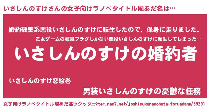 | 男性向けラノベタイトル風あだ名 | 『うちの娘の為ならば、俺はもしかしたらいさしんのすけも倒せるかもしれない。』 |