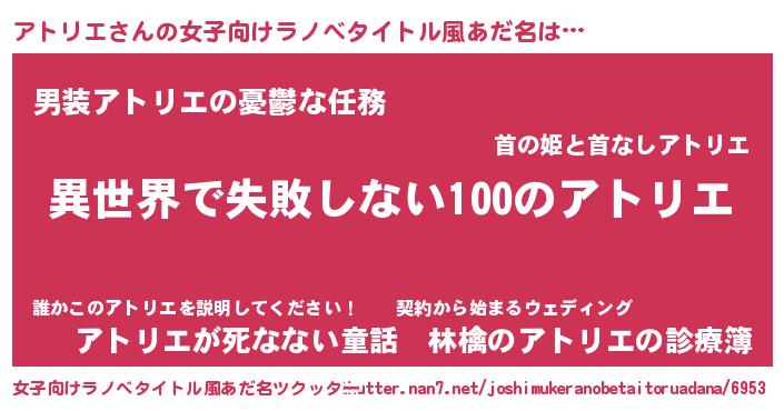 | 男性向けラノベタイトル風あだ名 | 『アトリエという概念が存在しない退屈な世界 』 |