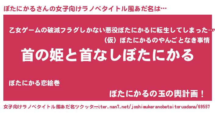 ぼたにかるさんの女子向けラノベタイトル風あだ名は… 『首の姫と首なしぼたにかる』『乙女ゲームの破滅フラグしかない悪役ぼたにかるに転生してしまった…』『ぼたにかるの玉の輿計画!』 ツクッター #女子向けラノベタイトル風あだ名ツクッター http://tkutter.nan7.net/joshimukeranobetaitoruadana/69557/