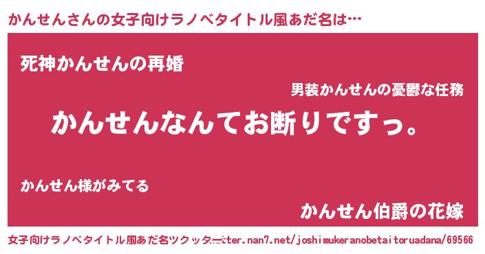 かんせんさんの女子向けラノベタイトル風あだ名は… 『かんせんなんてお断りですっ。』『死神かんせんの再婚』『かんせん伯爵の花嫁』 ツクッター #女子向けラノベタイトル風あだ名ツクッター http://tkutter.nan7.net/joshimukeranobetaitoruadana/69566/