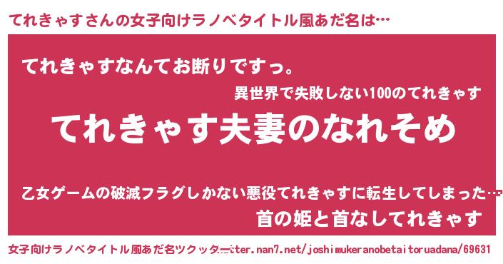 | 男性向けラノベタイトル風あだ名 | 『おまえをオタクにしてやるから、俺をてれきゃすにしてくれ! 』 |