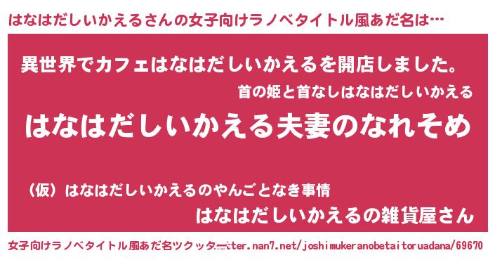 | 男性向けラノベタイトル風あだ名 | 『おまえをオタクにしてやるから、俺をはなはだしいかえるにしてくれ! 』 |