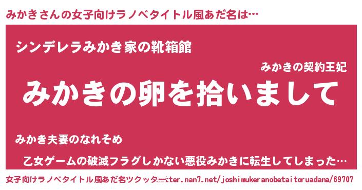 | 男性向けラノベタイトル風あだ名 | 『みかきの嫁は女の子じゃないと思った?』 |