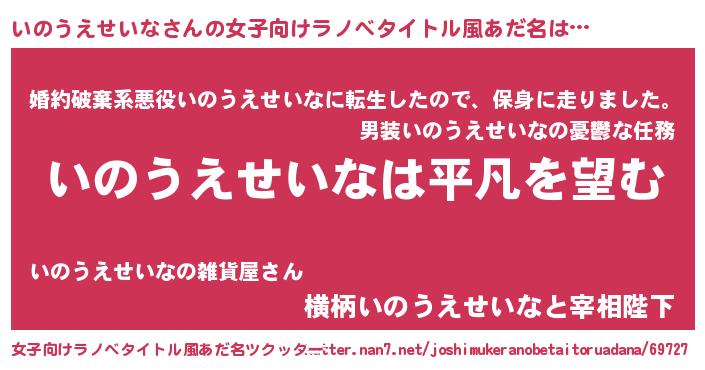 | 胡散臭い通販商品みたいなあだ名 | 『信頼と実績のサプリメント…その名も「いのうえせいな」』 |