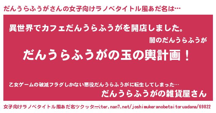| 男性向けラノベタイトル風あだ名 | 『だんうらふうが~年齢イコール彼女いない歴の魔法使い~』 |
