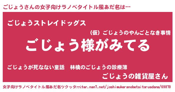 | 男性向けラノベタイトル風あだ名 | 『ごじょうの嫁は女の子じゃないと思った?』 |