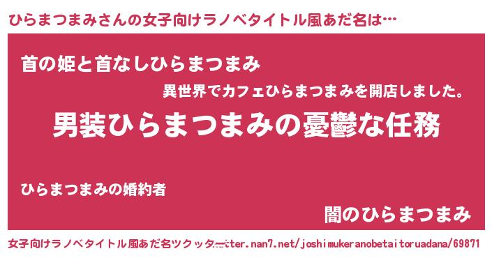 | 男性向けラノベタイトル風あだ名 | 『うちのひらまつまみが世界を掌握している!』 |