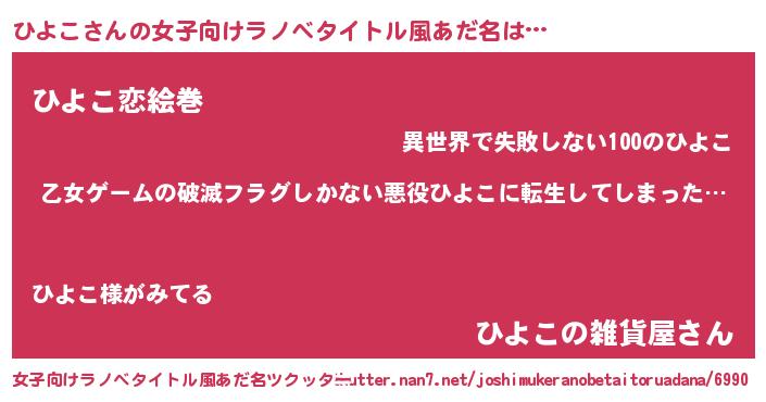 | 男性向けラノベタイトル風あだ名 | 『この素晴らしい世界にひよこを!』 |