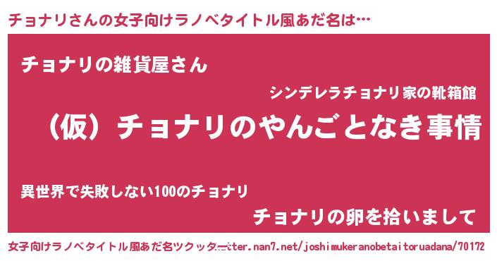 | 男性向けラノベタイトル風あだ名 | 『チョナリの憂鬱』『緋弾のチョナリ』 |