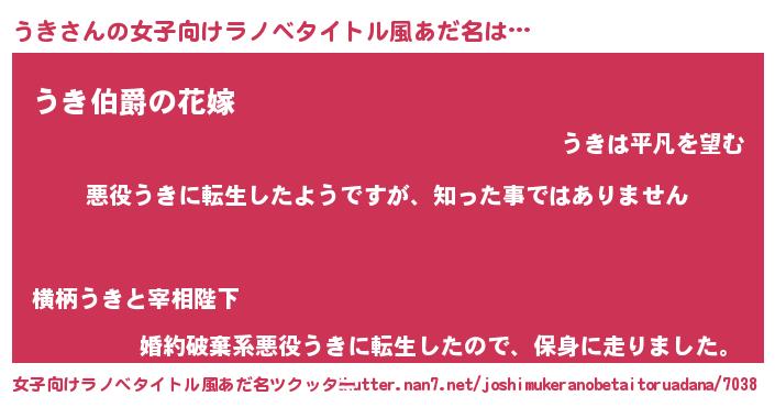 | 男性向けラノベタイトル風あだ名 | 『この素晴らしい世界にうきを!』 |