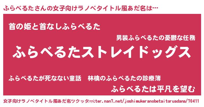 | 男性向けラノベタイトル風あだ名 | 『Re:ふらべるたから始める異世界生活』 |