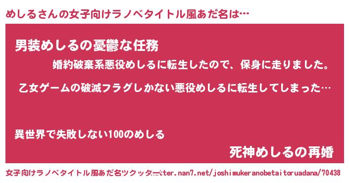 | 男性向けラノベタイトル風あだ名 | 『この素晴らしい世界にめしるを!』 |