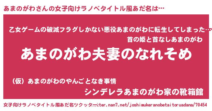 | 男性向けラノベタイトル風あだ名 | 『おまえをオタクにしてやるから、俺をあまのがわにしてくれ! 』 |