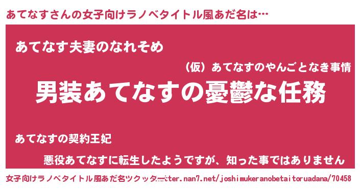 | 男性向けラノベタイトル風あだ名 | 『うちのあてなすが世界を掌握している!』 |